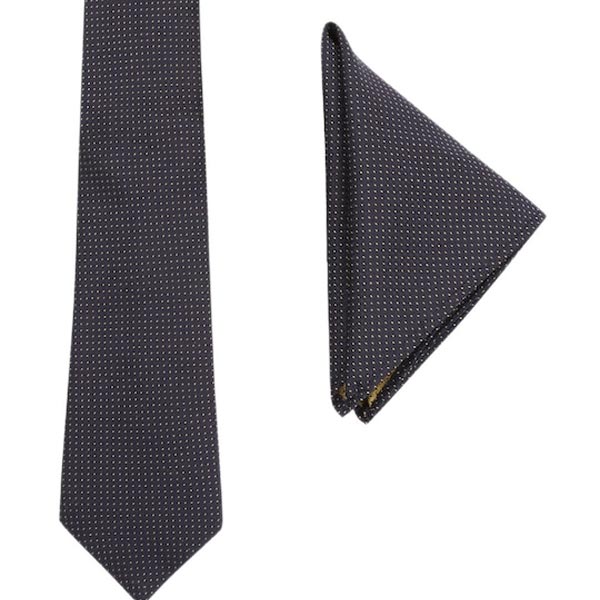 This accessory gift set consists of a tie, a pocket square, a pair of socks, a pair of cufflinks, a tie clip, a lapel pin, a belt, and a wallet